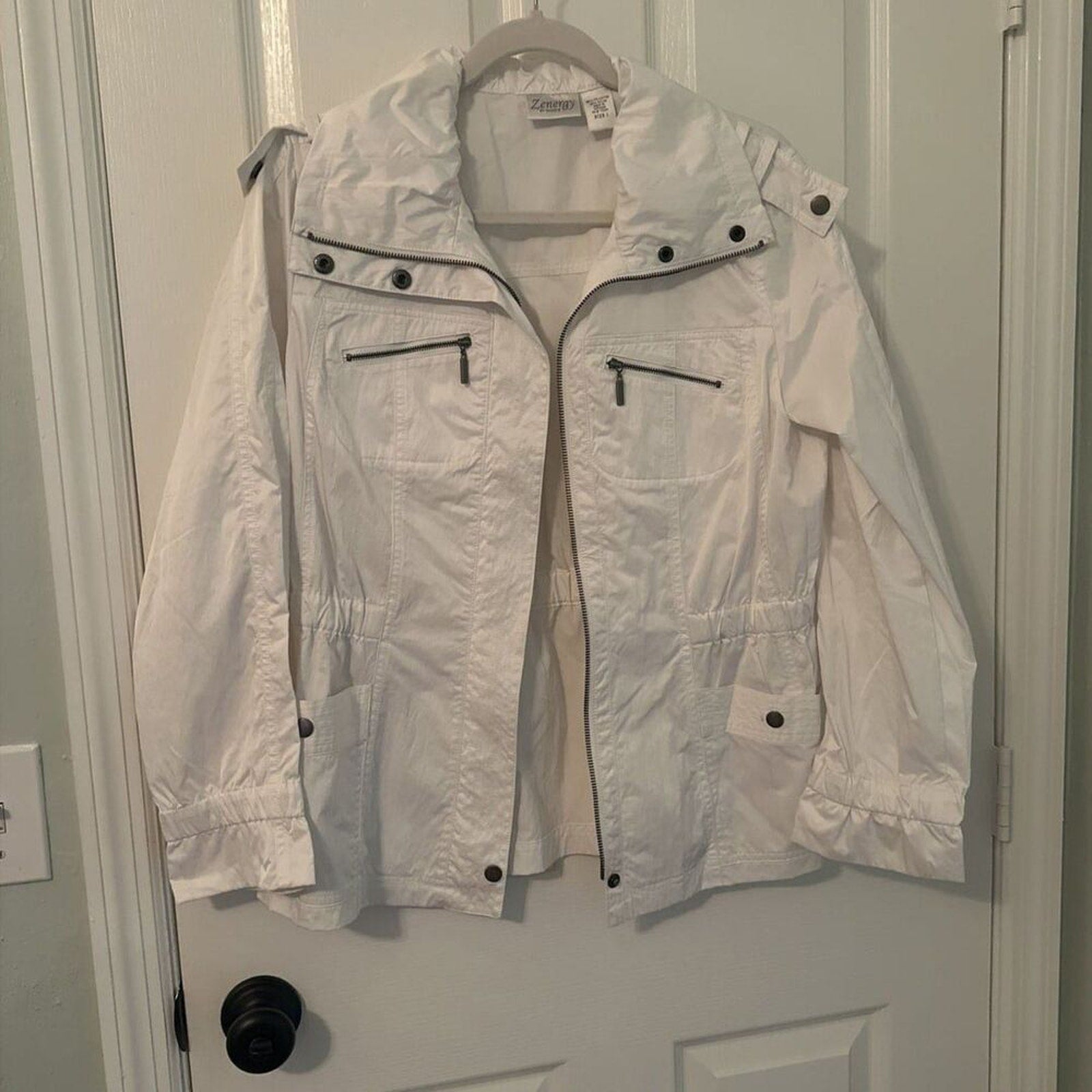 This stylish white jacket from Chico's features a modern design with multiple zippered pockets for added functionality. It's perfect for layering in cooler weather, offering both comfort and fashion. Ideal for casual outings or adding a touch of sophistication to any outfit. Size 1-M
